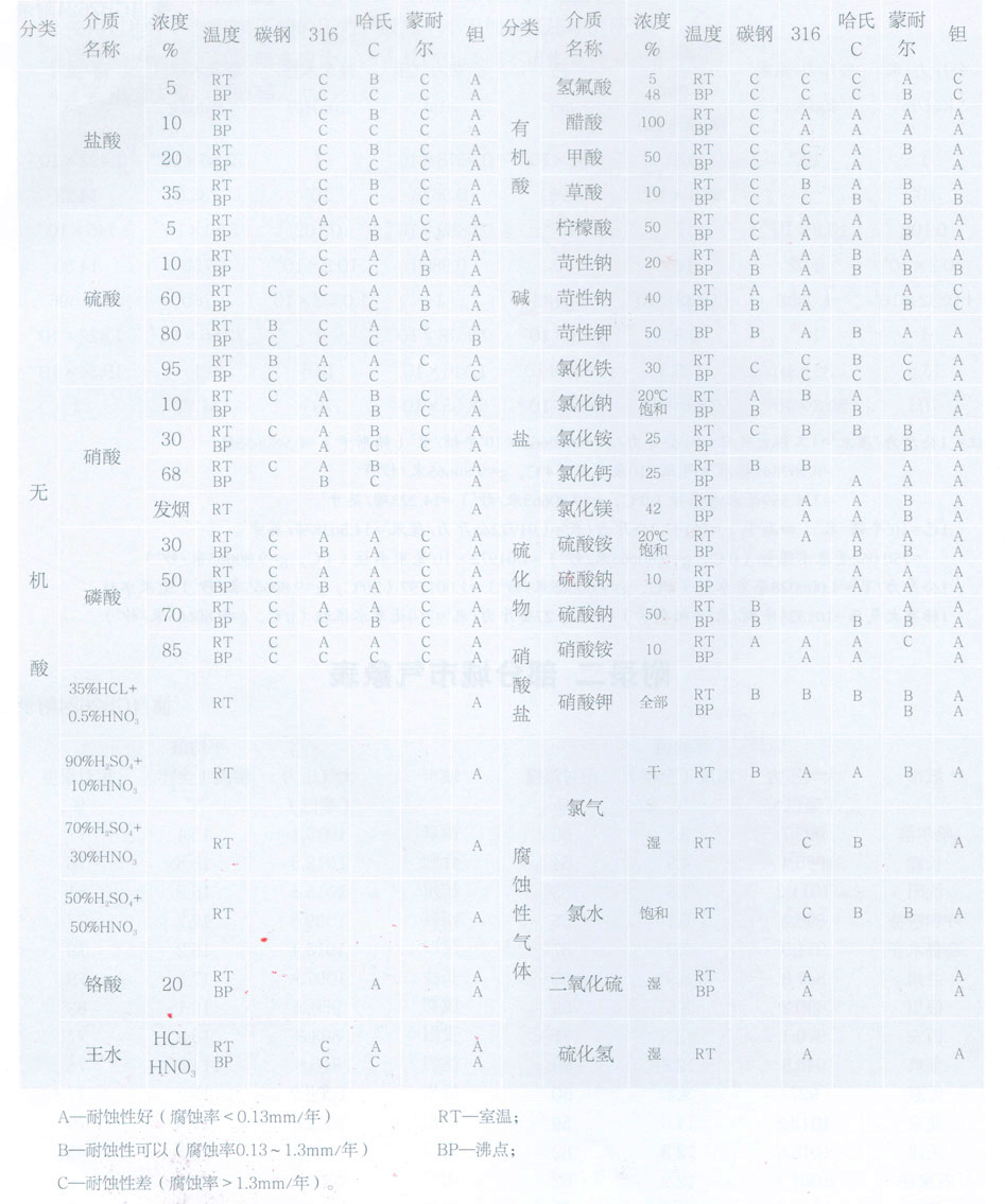 接觸介質(zhì)部分材質(zhì)的耐腐蝕性參考表
